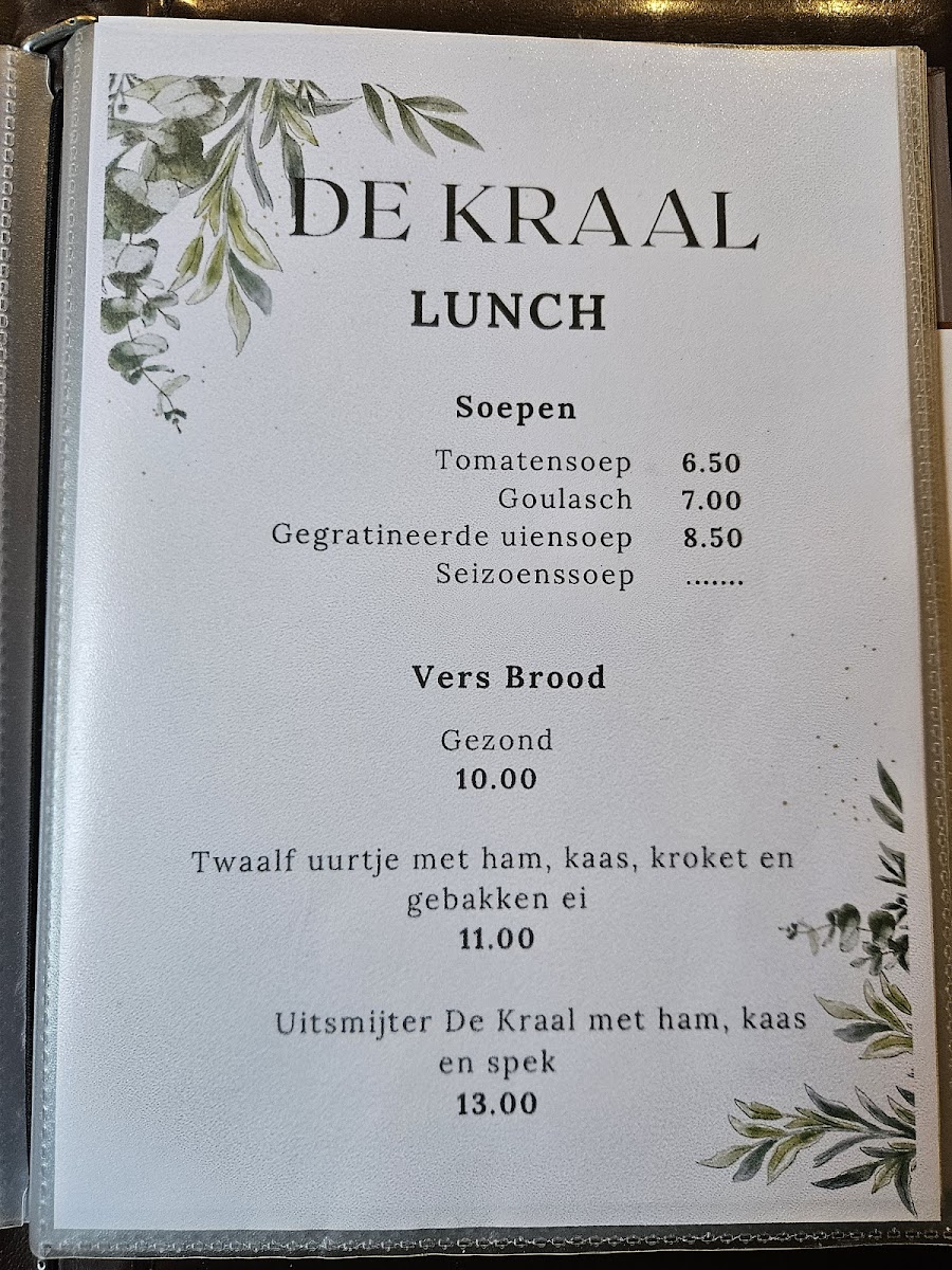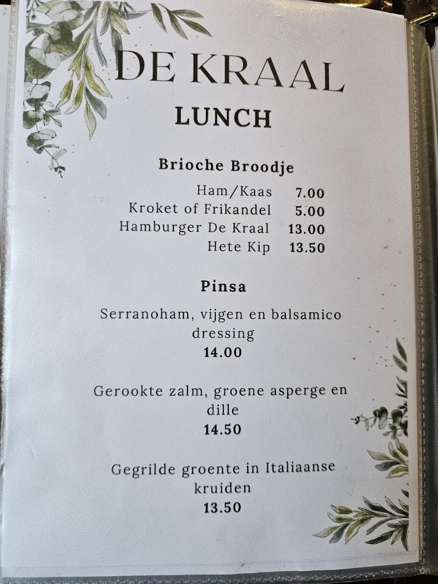 The menu at Restaurant De Kraal offers a well-balanced mix of hearty comfort food and lighter, sophisticated options that cater to a range of tastes. Starters like the rich and flavorful Uiensoep set the tone, warming diners with its deep, savory layers. For mains, the succulent Spareribs stand out, perfectly cooked and generously portioned, while the fresh Parel Couscous Salade Met Burata provides a lighter, yet equally satisfying option with its delicate textures and creamy burata. Snack lovers will appreciate the crisp, golden Loempia, a perfect blend of savory fillings wrapped in a delicate pastry. The menu’s thoughtful variety ensures that each dish is distinctive yet approachable, balancing indulgent flavors with fresh, refined touches, making Restaurant De Kraal a compelling destination for both casual meals and more celebratory dining experiences.